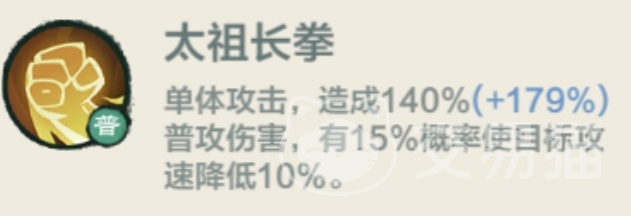 太祖长拳,单体普攻技,可以对敌人造成超高倍率的伤害,并且有一定几率对敌人施加迟缓的负面效果,只要敌人被挂上迟缓控制,拳师就可以在极短的时间内造成更高的换血率,不仅是对boss,竞技场中也是如此,这个技能也可以作为很好的起手技,提升后续技能的命中率效果。这里的换血率是指换血效率,在敌人被施加了迟缓状态后,拳师能以更低的血量损耗来对敌人造成更多的 伤害,输出端就更强势。
