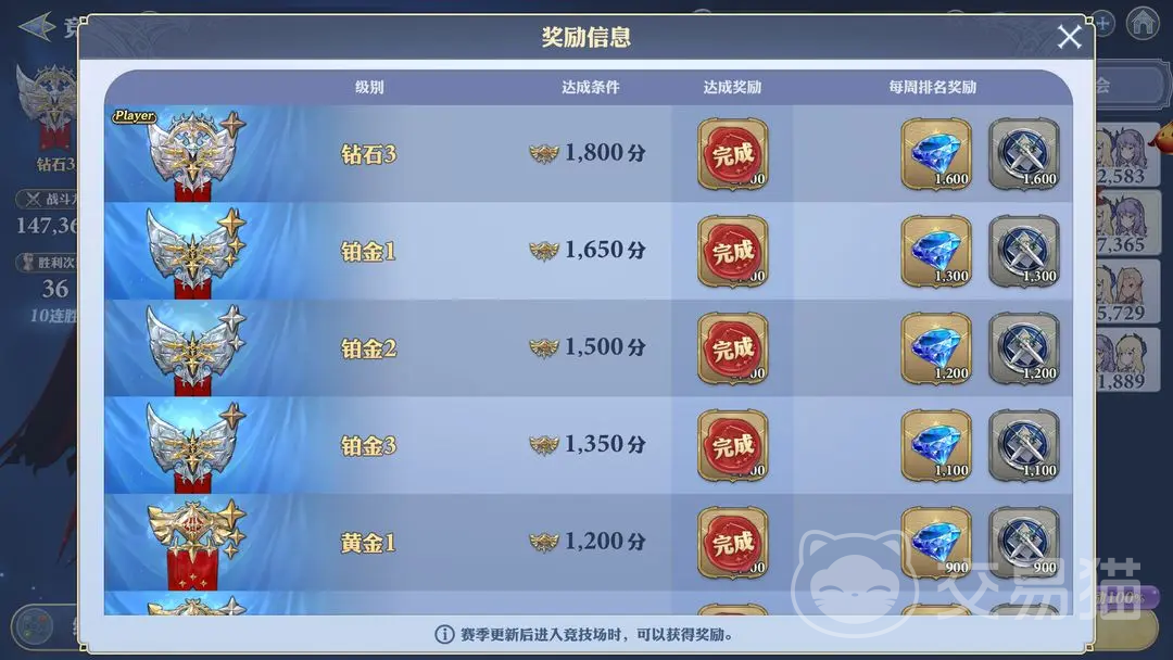 竞技场这个模式里面提供的奖励也是比较丰厚的,尤其是当大家的段位首次达到某个段位时,就可以得到一次性的奖励,然后每周可以获得一次排名的奖励,除了钻石之外,还有可以在商店兑换使用的积分。