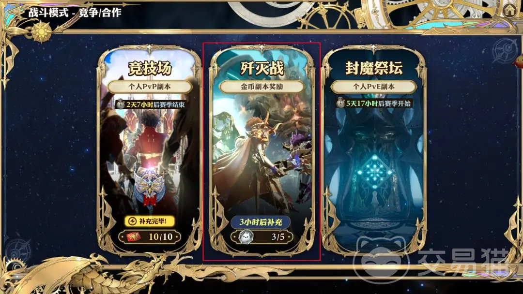 想要玩这个模式,首先需要在菜单里面找到“竞技/合作”的选项,点击该选项,就可以进入到对应的页面当中,在该页面里面有三种玩法,一个是歼灭战,另一种是封魔祭坛的pve玩法,还有最后一种就是竞技场的玩法了,点击就可进入。