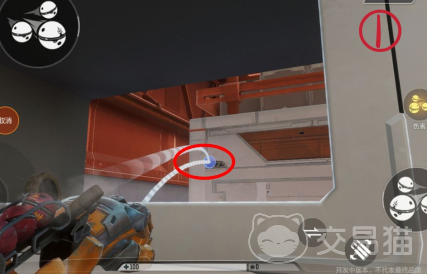 选择热浪的玩家可以来到到A大路的这个柱子上面,利用二技能直接飞上去,然后蹲下来让一技能的拐弯处轨道正好是前面的红色柱子拐角处,就能站在上方直接攻击下图A点角落高台的敌人。