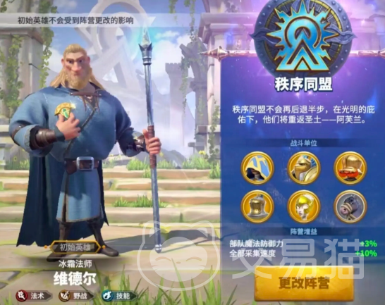 然后要介绍的是秩序同盟,这其实代表的是人类阵营,选择这个阵营将会有10%的采集速度加成,十分适合喜欢收集资源重视经济发展的玩家选择,此外该阵营还能提升魔法上的伤害。