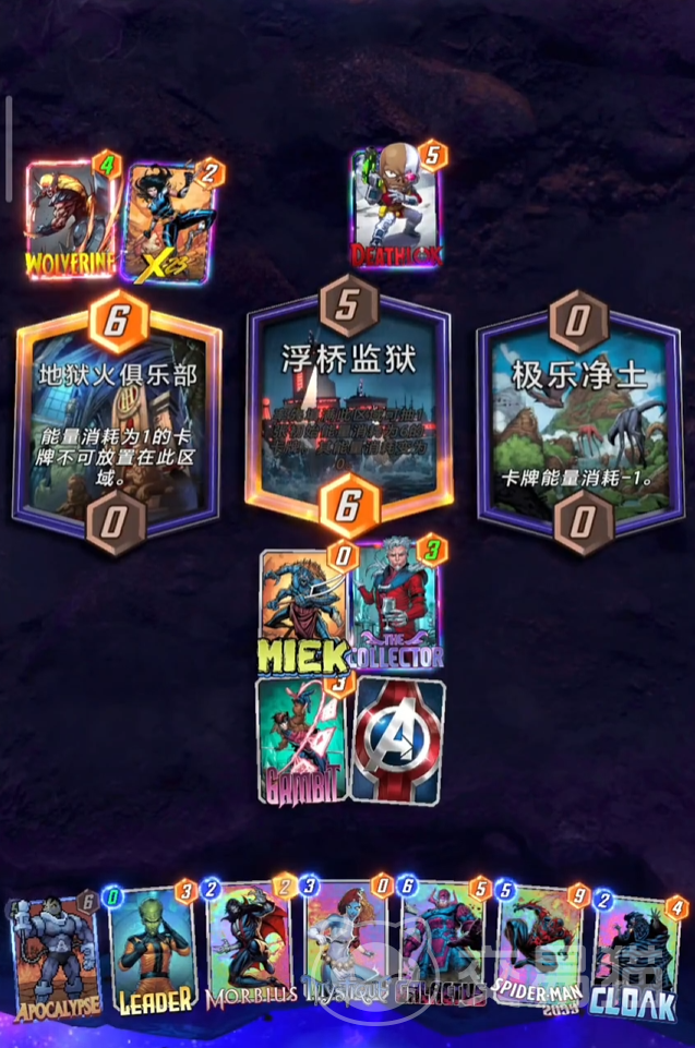 如果海姆达尔没有抽到手里,或者手上的能量值有更重要的安排,可以考虑用性价比更高的幽灵蜘蛛来进行移动,幽灵蜘蛛能让上一张被放置的己方卡牌移动到自己的区域,最关键的是这张卡的耗能比较低,而且整套流程可以在一个回合内完成,指向性也比较强,顺序是先拍下蜘蛛侠2099,然后在另一个需要破坏卡牌的区域拍下幽灵蜘蛛,要注意的是需要预留出空位,不然是无法移动过去的。