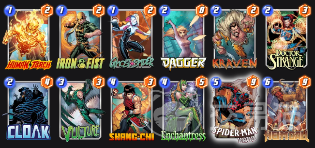 虽然这张卡的效果是和移动有关的效果,但是本身是不能进行移动的,所以需要用到海姆达尔这张卡牌,海姆达尔同样有着9点的高额战力,并且他还能把本区域的其他卡牌向左移动一个区域,这样把蜘蛛侠2099放到他的区域以后就能激活蜘蛛侠的效果,并且因为两张卡的战力都很高,所以能变相的控制两个区域,让敌人被迫把要放在一个区域的卡分开放置。