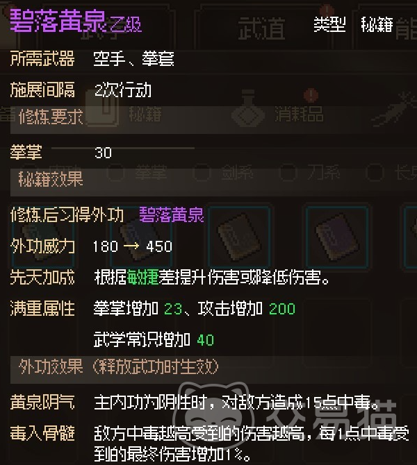 碧落黄泉能再内功是阴性的时候对敌方造成15点的中毒,且敌方每受到1点的中毒,使用者就能提升1%的伤害。
