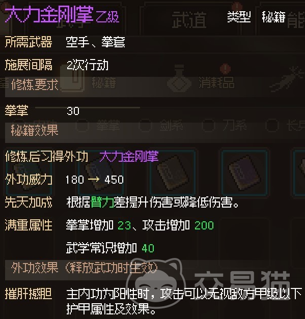 大力金刚掌也有两个效果,第一个效果是在内功为阳性的时候,能让攻击无视敌方甲级以下的护甲属性,第二个能在自身仁德高于0的时候,每高上10点就能对敌人造成2点的内伤,但如果自身仁德低于0的话,每低上10点就会对自身造成1点的内伤。