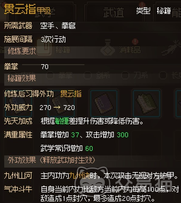 该武学同样也有三个效果,第一个会在内功是九州诀的时候触发,效果为攻击无视敌方的护甲,第二个效果是自身内力比敌方内力每高上100点,就对敌人造成1点的封穴,不过这个效果最多只能叠加到20点,第三个效果是敌方的封穴越高,就对其造成更高的伤害。