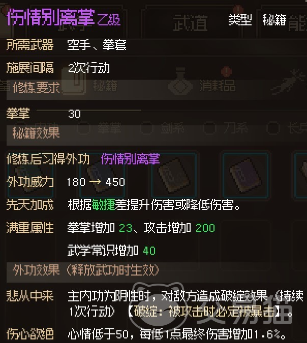 伤情别离掌能在内功是阴性的时候,对敌人造成破绽效果,破绽效果能让其在被攻击的时候必定会造成暴击伤害,且该功法在心情低于50的情况下,每低1点就造成额外1.6%最终伤害。