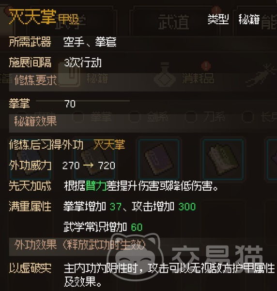 灭天掌需要搭配上阴性的内功使用,这样在攻击敌人时可以无视敌方的护甲属性和效果,且敌方的生命值越少功法能造成的最终伤害就越高,满生命时候的最终伤害也能增加至150%。