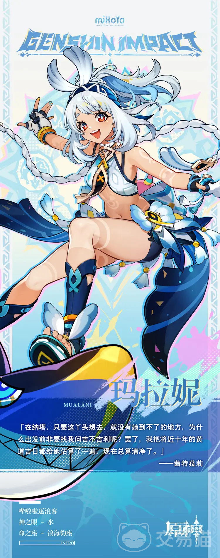 如果命中的敌人拥有猎物的标记,那么首先将标记消除,同时对周围最多五个有五个猎物标记的敌人,发射鲨鲨飞弹,让敌人受到额外的伤害。元素爆发”爆瀑飞弹”,可以发射具有追踪功能的特大号鲨鲨导弹,命中位置的敌人受到水元素范围伤害。