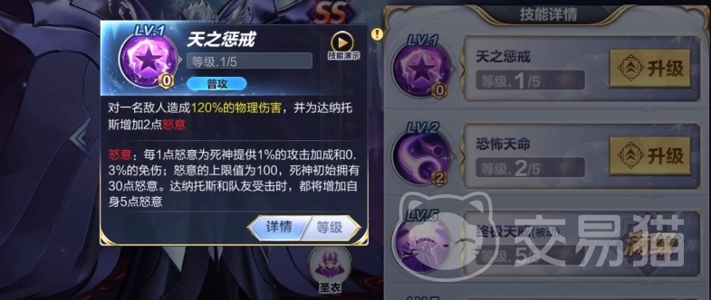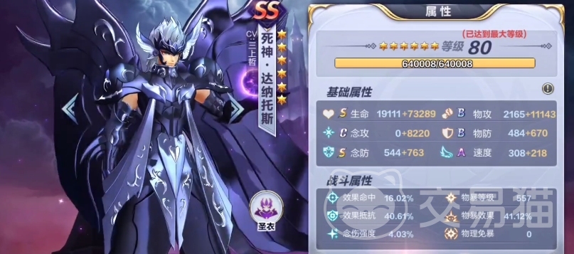 死神达纳托斯的技能组合和天赋属性还是很出色的,他的技能包括“终极天威”、“死神凝视”和“恐怖天命”,这些技能在觉醒后能提供超多的怒意、同时上海表现也很高,更是具备控制解除的能力,同时达纳托斯还拥有破碎小宇宙效果,减少敌方双防并增加自身抗性和吸血,这些特性使其在战场上既难以被击败也能造成巨大伤害。