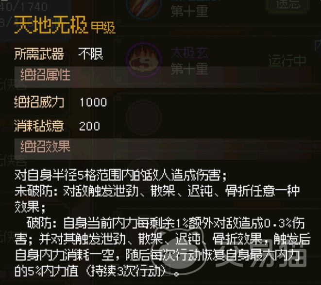 虽然天地无极非常强大,但游戏中还有另一门强大的招式——太极十三式。太极十三式可能在某些方面超越了天地无极,因为它的伤害似乎与血量成正比,并且不受反伤影响。