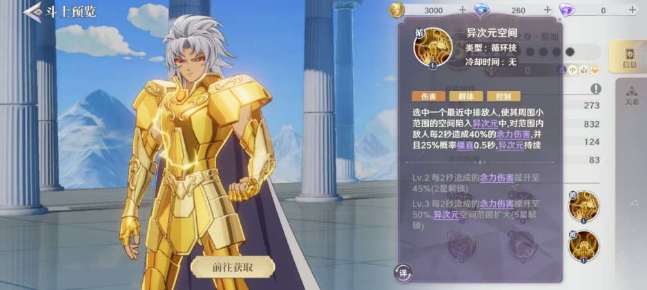 他真正的力量其实来自于他的必杀技星群爆发,这个技能不仅对全体敌人造成念力伤害和物理伤害,还附带了两秒钟的眩晕效果,这种强大的群体伤害和控制效果,足以搭配很多阵容,而撒加的循环技能异次元空间,更是展现了他对空间的掌控能力。当撒加选中距离自己最近的中排敌人时,他能够使该敌人周围小范围内的空间陷入异次元中,在这个异次元空间内,所有敌人都会受到每2秒40%的念力伤害,并且很小的几率使敌人僵直0.5秒,这种持续的伤害和控制效果,使得敌人在面对撒加时倍感压力,虽然时间不长,但是也可以避免不必要的伤害。