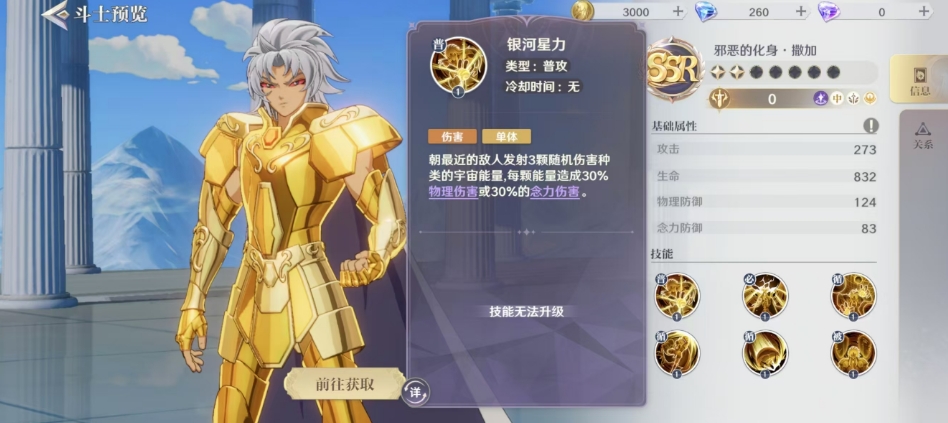 他的普攻技能银河星力激活后,会朝最近的敌人发射三颗充满神秘力量的宇宙能量球,每一颗能量球都蕴含着不同的伤害类型,随机造成一定的物理伤害或念力伤害,这种不可预测的攻击方式,使得敌人难以捉摸撒加的攻击模式,从而无法有效地进行防御。