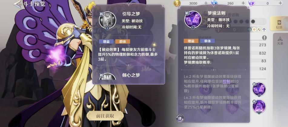 梦境牌2是引导之梦,同样是一种被动效果,但它增益的是群体,每层使友方前排斗士提升5%的物理防御和念力防御,最多可叠加3层,这种防御能力的提升,使得修普诺斯和队友能够在一段时间内抵御大量的伤害,梦境牌3是倾心之梦,也是一种被动效果,但它增益的是后排群体,每层使友方后排斗士提升10%的普通攻击和技能伤害,最多可叠加3层。