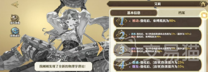除了这些主动技能,艾莉还有个挺实用的被动技能“魔法工程学”。这个技能虽然听起来高大上但其实很简单,就是给队伍里的每个小伙伴都加上一层“束缚抵抗”的buff,能增加60%的抵抗效果,让大伙在面对那些喜欢束缚人的敌人时更加从容不迫。虽然这个技能不像前两个那么耀眼,但在关键时刻也能发挥不小的作用。相对来讲这个技能还是比较实用的,会比其他两个技能更简单一点。