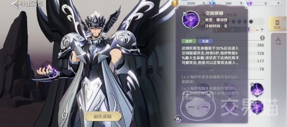 空间屏障这一被动技,当达纳托斯的生命值低于30%后,他会进入空间躲避攻击,持续5秒时间触发,在这期间,他每秒会恢复6%的最大生命值,而且不可被攻击,但是可以正常攻击敌人,而随着技能等级的提升,空间屏障的效果也会得到进一步增强,Lv.2时,每秒恢复生命值提升至8%,而当达到Lv.3时,每秒恢复生命值更是提升至10%,更为关键的是,进入空间躲避时,达纳托斯还会额外获得250怒气数值。