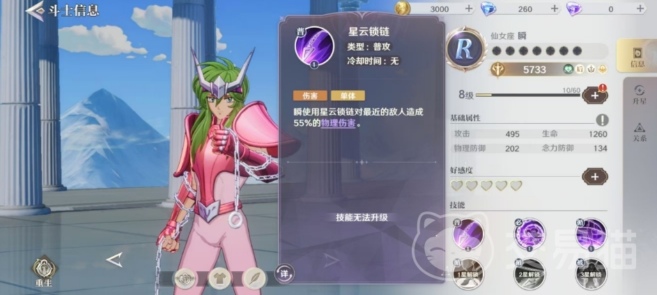 仙女座瞬,作为游戏中的R级角色,定位在后排,独特的星云锁链技能是普通攻击,能够针对最近的敌人造成55%的物理伤害,值得注意的是,瞬的这个技能是不可以升级的,但是除了基本的攻击力,瞬还拥有一个名为旋转防御的必杀技,这是一种群体增益技能。