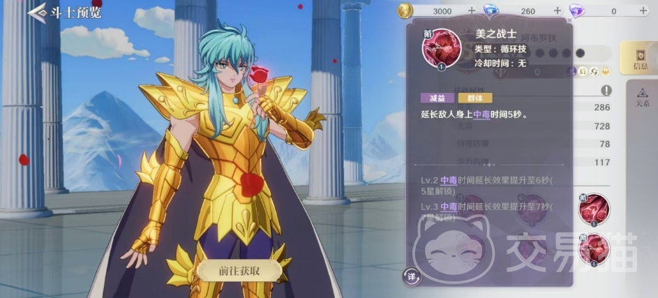 而美之战士循环技,则是阿布罗狄最后一个但同样强大的技能,这个技能可以给面对面的群体都施加减益效果,延长敌人身上中毒时间的5秒,随着技能等级的提升,中毒时间延长效果也会逐渐增强。升级之后中毒时间延长效果提升至6秒,最高可以让中毒时间延长效果提升到7秒,这个技能的效果使得敌方在中毒状态持续期间,其他所有技能效果都将失效,并且无法通过攻击获得觉醒值,而且该状态无法被其他守护触发或清除,所以还可以保护我方角色。