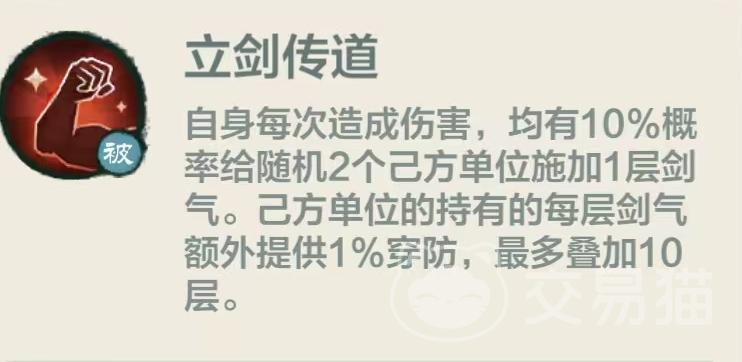 而被动技能“立剑传道”,使得剑尊在造成伤害时有几率为己方单位施加剑气,同时己方单位只有剑气时,能够为剑尊提供加成,使剑尊的穿防得到提升。