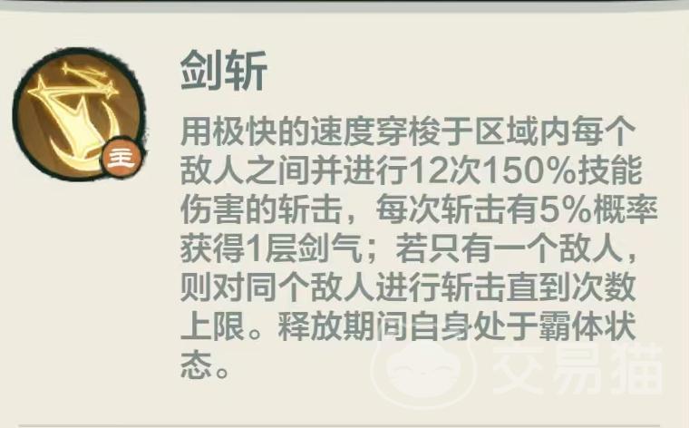 主动技能“剑斩”的使用,使得剑尊能够快速对场上的敌对玩家进行攻击,并且每次攻击都使剑尊有概率获得剑气,从而进一步提升技能所造成的伤害,同时在技能释放时,剑尊处于霸体状态,随着角色星级的提升,绝世剑尊的技能也会得到极大提升,使用剑斩后不再是霸体状态,而短时间的无敌,同时能够额外造成伤害。使得剑尊即使面临众多敌人,也可以很好的生存下来并且进行输出。