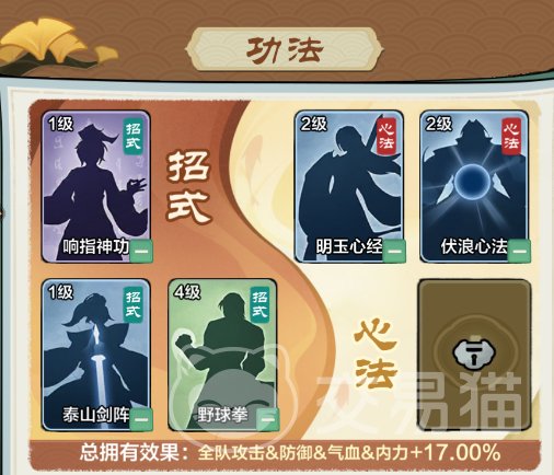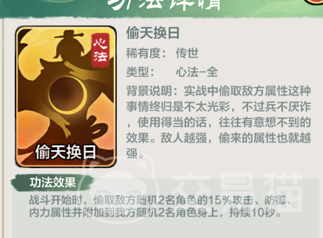 推荐理由:偷天换日这个心法其实是比较适合大部分角色来进行使用的,主要是增加队伍的攻击努力,算是橙色功法当中十分万能的一个了!