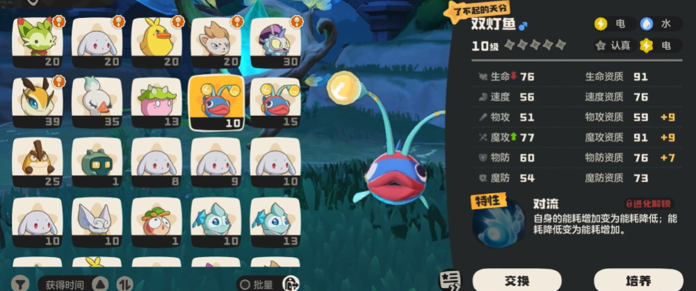 【双灯鱼】这是一个非常强大的精灵,自身不仅属于电属性还有水属性的加成,在升级净化后,可以解锁【对流】玩法,让自身的消耗数值降低,而且可以让敌人的能消耗变成增加效果,算是一个比较吃策略性的精灵之一,但是需要注意的是这个精灵是比较合适在pvp玩法中出现的!第一阶段的双灯鱼在精力、魔攻和速度方面表现尚可,但攻击、防御和魔抗相对较低。利灯鱼作为双灯鱼的进化形态,在各项属性上均有显著提升,尤其是精力和魔攻方面。适合喜欢策略战斗和宠物养成的玩家培养和使用。