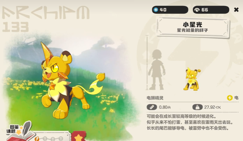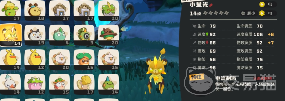 【小星光】作为电系宠物,拥有金黄色的毛发,而且外观非常的可爱。其种族值在攻击和速度方面表现较为突出,但防御和魔抗相对较低,算是一个带有拉条效果的精灵,在对局开始阶段,可以携带一个光系技能进入对局,让入场的效果延长一个回合,在特殊对战玩法中可以选择使用这个精灵,基础的数值还是比较不错的!成为了雷系宠物中的一匹黑马。其灵活多变的战斗风格和强大的生存能力,使得它在面对不同对手时都能展现出强大的竞争力。