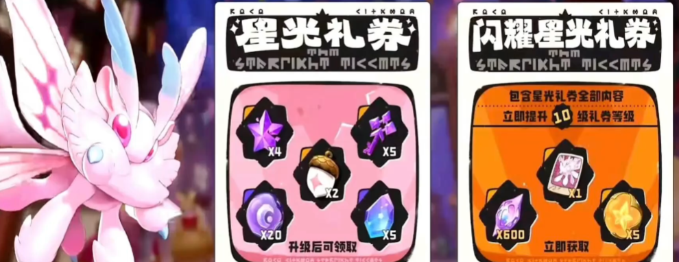 本次测试更新了两个需要玩家们去进行氪金的玩法,首先就是【星光礼卷】,需要玩家们话费68元人民币去尽显解锁,玩家们升级成功后,则可以领取养成材料以及高级捕捉道具!第二个选择则是可以获得月光队中的主C精灵【绒仙子】,玩家们需要花费128元人民币全区进行解锁,购买后,可以立即升级到10级!