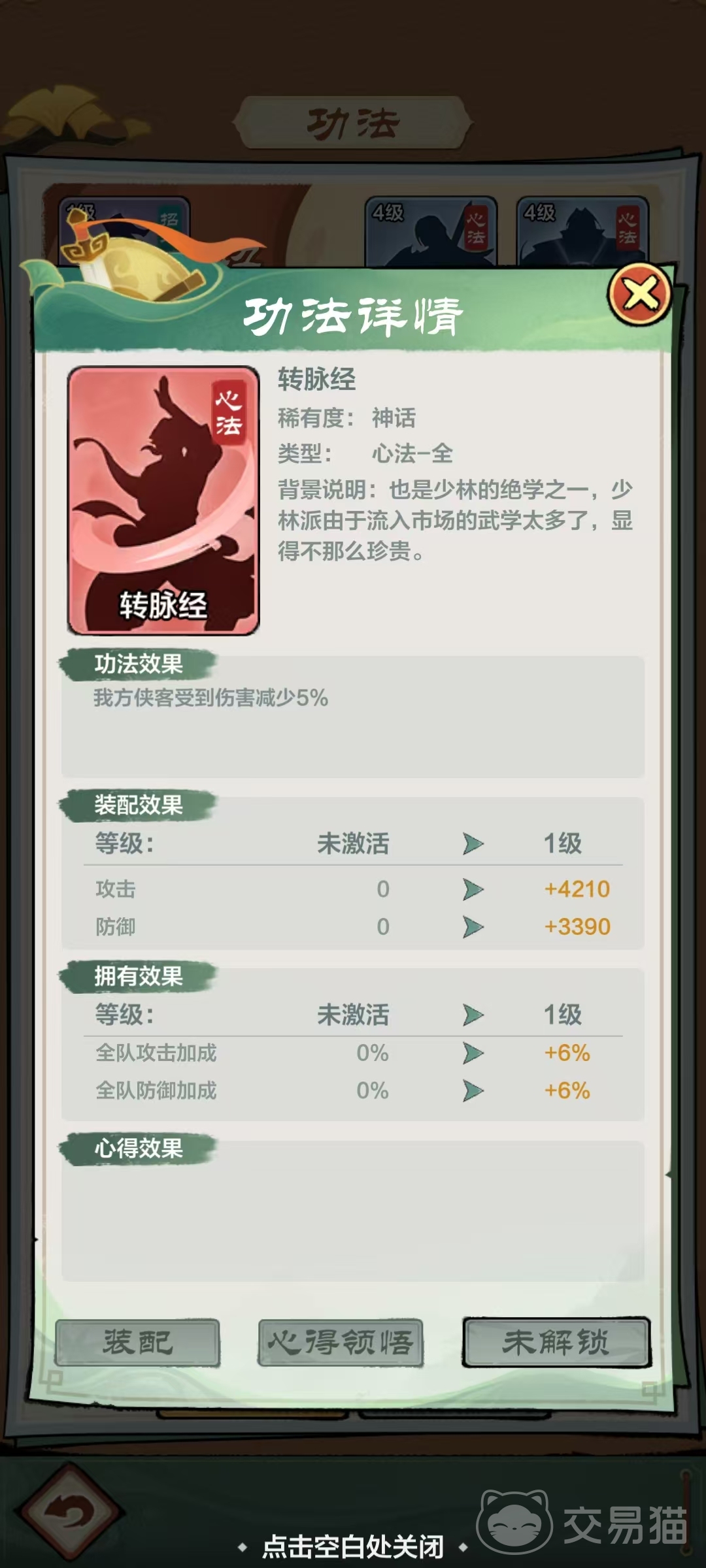 金蟾坠的效果是在开场后的10秒内,我方全体伤害增加15%,作为一款神话品质心法,在开场爆发方面有着非常出色的表现,非常适合走开场爆发玩法的玩家选择。转脉经也是神话品质稀有度,效果非常简单,就是使我方侠客受到的伤害减少5%,看似简单但是实战中的应用却非常出色。大家千万不要小看5%的减伤,可以大幅提高生存能力,而且适用性非常广泛,所有流派都可以选择。