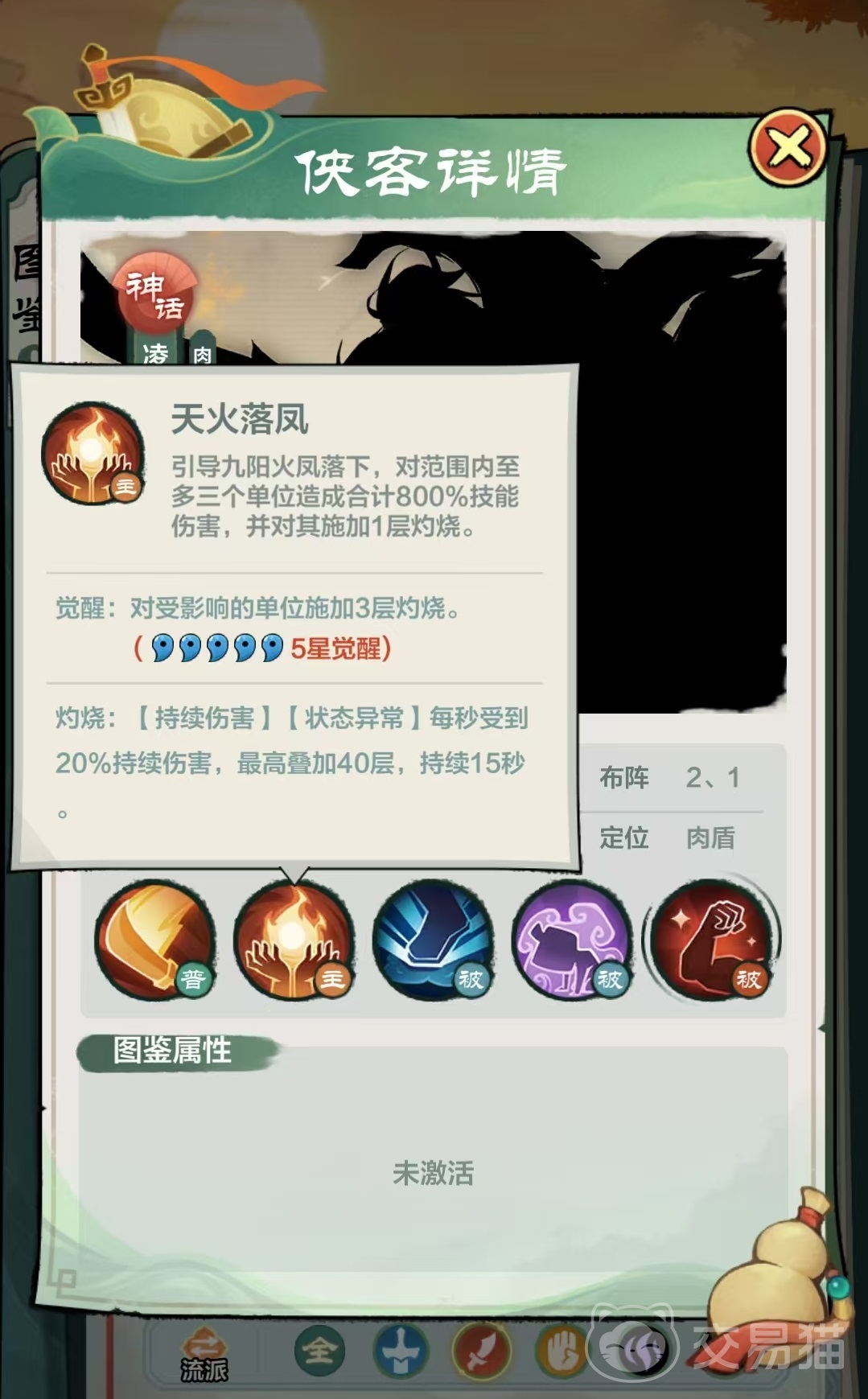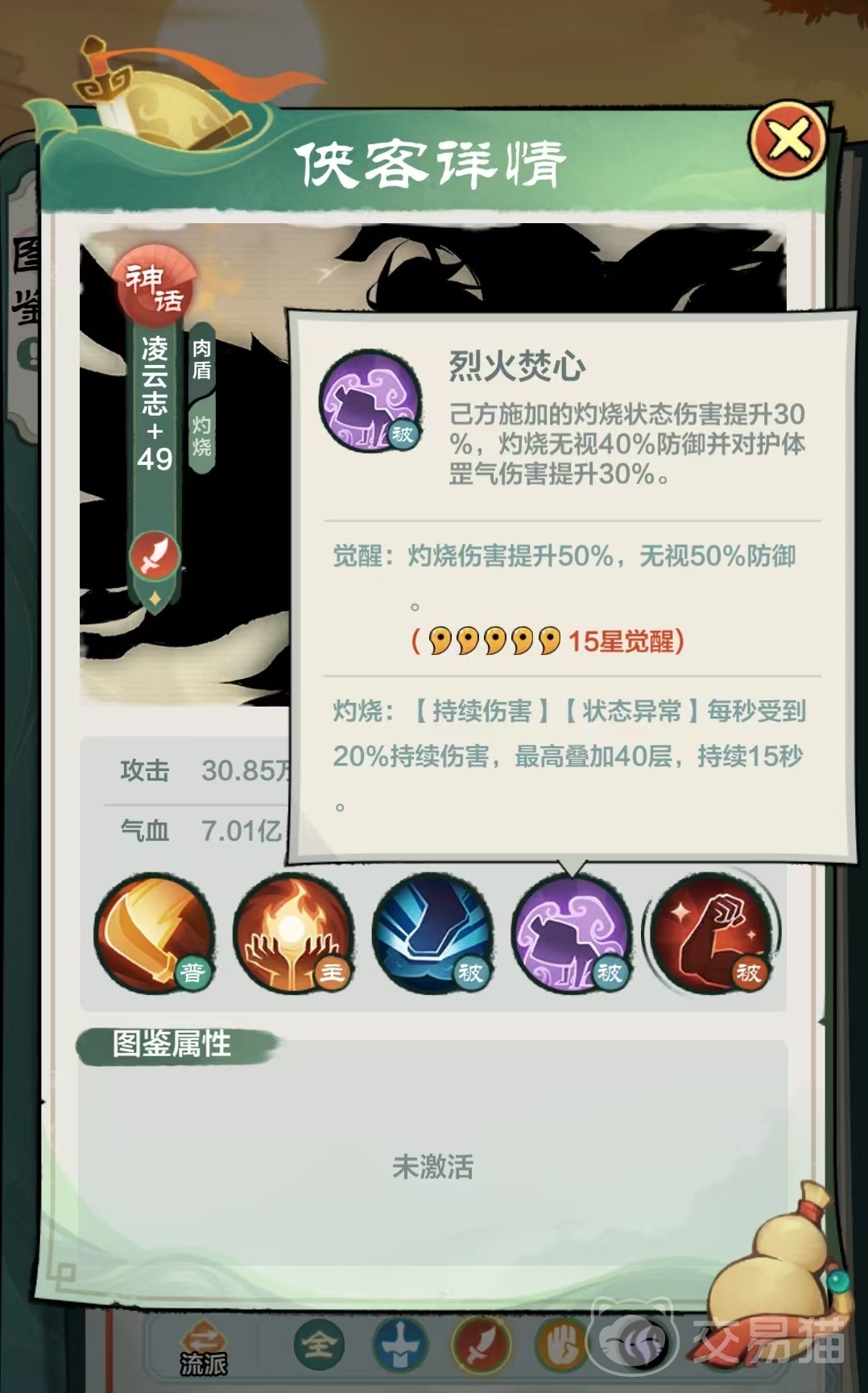 主动技能天火落凤,引导九阳火凤落下,造成范围内最多三个单位合计800%技能伤害,并对其施加一层灼烧,觉醒之后对受影响的单位施加3层灼烧。第1个被动技能灵火墙,在进入战斗中之后,凌云志自身防御和生命属性提升10%,敌方单位每有一层灼烧效果,对自身造成伤害就降低10%,最多计算6层。觉醒之后防御和生命值提升为20%。这一被动的效果是为对方附加了灼烧之后,不仅有持续伤害,更是可以降低自身受到的伤害。如果对方身上带有6层或6层以上,那么只能对凌云志造成40%伤害,这对于肉盾来说大大提高了生存能力。