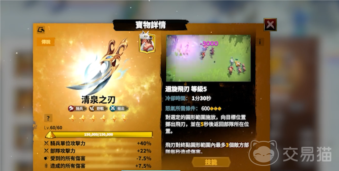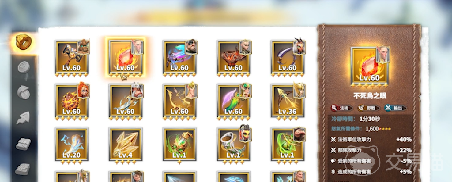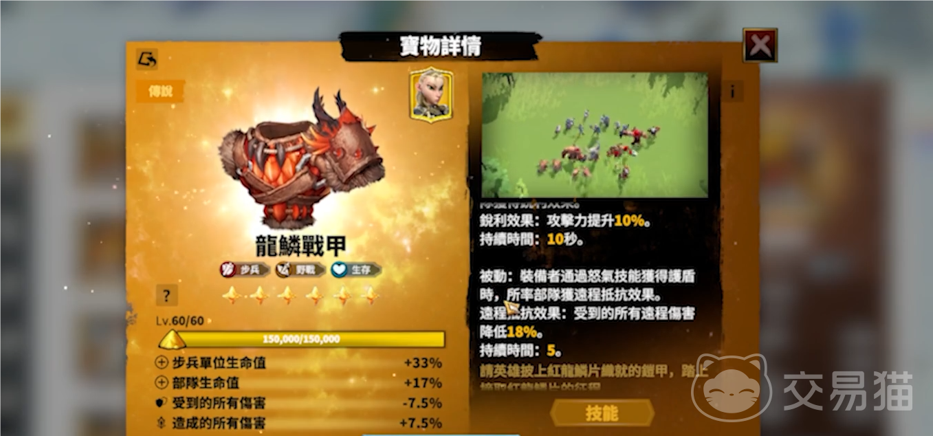 S级装备:库拉塔的愤怒可以提升对暗黑精灵的伤害,在打暗黑精灵的时候可以用它,步兵用巨骨和预言法典,骑兵选择荣耀护身符除了巨骨加伤害之外,预言法典的aoe护盾和护身符的减伤都是防御方面的能力。