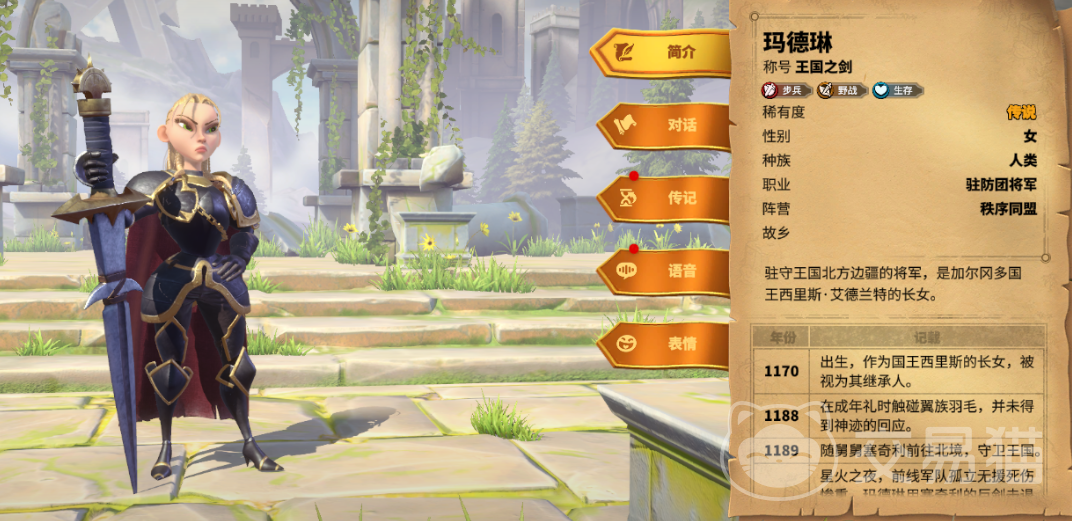 她的第二个被动能让部队造成的反击伤害提升5%,部队中步兵单位的生命值提升5%,她的最后一个被动能在主动技带来的护盾被打破的时候,对周围圆形范围内最多三个部队造成一次超高伤害,她的觉醒技可以让主动技再额外得到一个抵抗效果,从而让接下来四秒内所受到的伤害再降低10%。