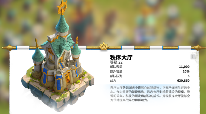 建议每一位小伙伴都优先提升秩序大厅的等级,因为秩序大厅作为城市系统中的核心建筑,限制着其他建筑的等级上限,也是解锁更多功能与科技的前提,初期建议大家将所有资源集中进行升级,差不多提升到11级才够前期发展。