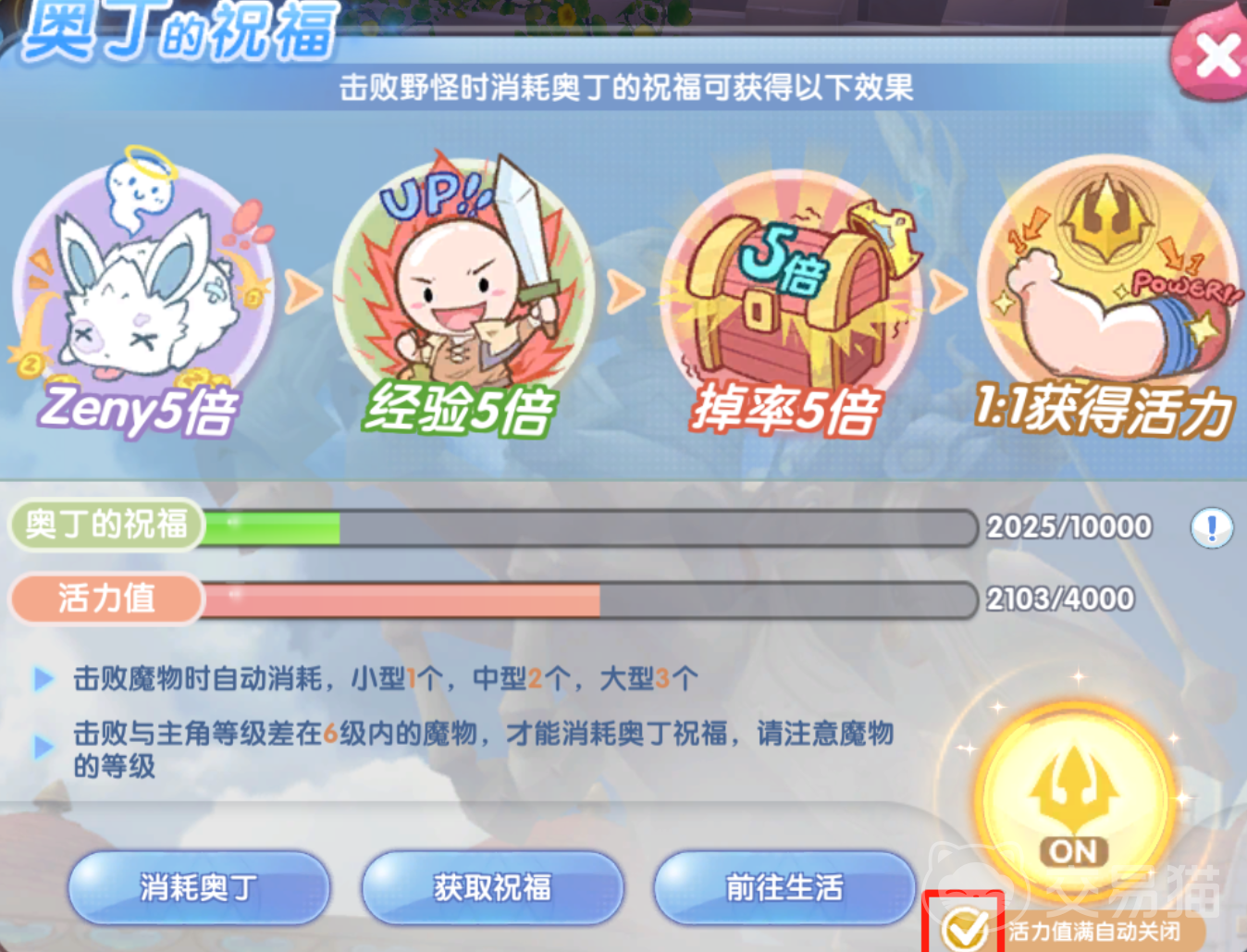 最后就是奥丁的祝福,这个祝福可以理解为经验加成的buff,使用这个道具可以获得额外的经验乘坐,除了经验还可以增加道具的掉落概率,可以通过消耗活力来获得奥丁的祝福,就是刷怪的时候注意怪物等级。