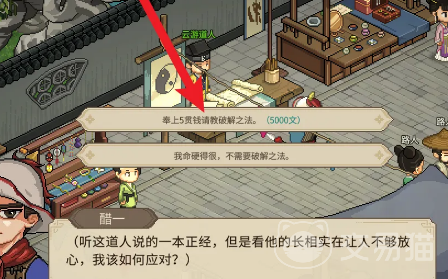 云游道人是一个神秘的人物,他掌握着许多不为人知的秘密。在游戏的某个特定时间点,他会告诉你将会遇到血光之灾。这时候,玩家需要做出选择,是花费5贯钱请教破解之法,还是置之不理。显然,愿意花钱的玩家将会有所收获。