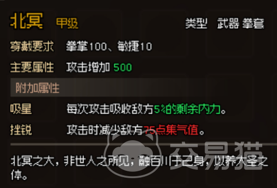 而“北冥”则以其吸星和挫锐属性闻名,每次攻击都能吸收敌方的部分内力,同时削弱其集气值。北冥之大,或许只有穿上这款拳套的武林高手才能体验一二。