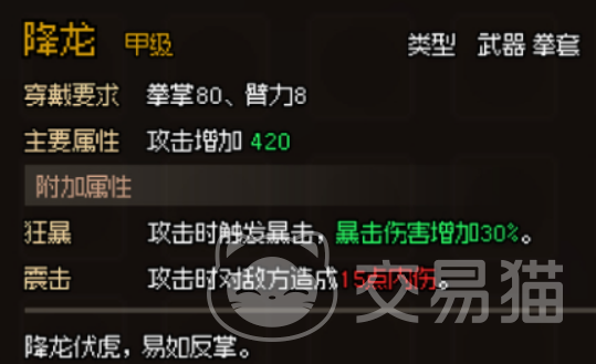 “降龙”拳套则是以力量著称,穿戴者可轻松触发暴击,暴击伤害增加30%,对敌方造成15点内伤。其狂显与震击的效果,仿佛让人感受到真正的降龙伏虎之力。