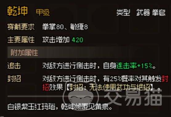 最后我们来谈谈“乾坤”,这款拳套以其追击和封招的特性,成为战场上的控制大师。在侧击时,自身连击率提升,且有概率触发封招效果,使对手无法使用武功技,这种能力在对决中无疑是致命的。