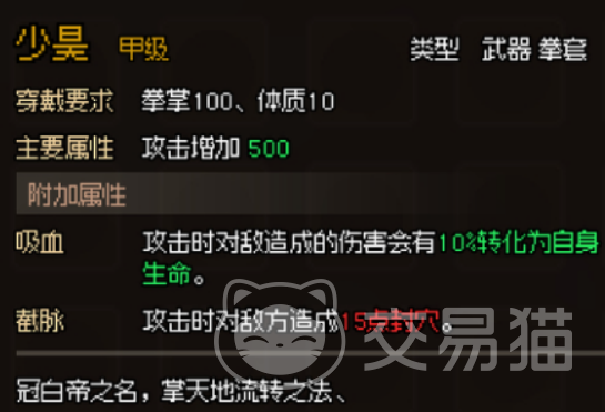 紧随其后的是“少昊”,这款以神名命名的拳套,蕴含着天地间的流转之力。除了同样提供500点攻击力外,它还具备吸血和截脉两大特性,能在攻击时将伤害转化为生命力,同时封住敌人的穴位,使其动弹不得。