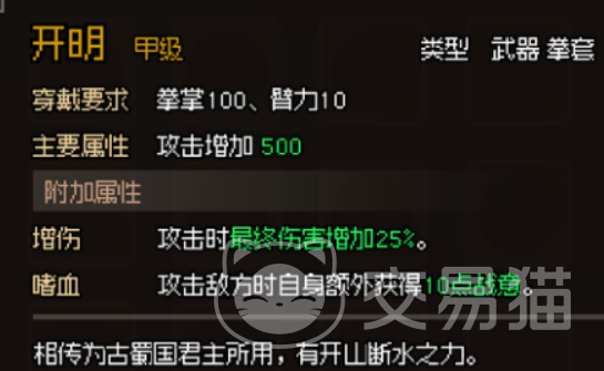 首先让我们聚焦于“开明”这款拳套。据说它曾是古蜀国君主的御用之物,有着令人难以置信的力量。穿戴者不仅能够获得500点攻击力的加持,还能在战斗中增加25%的伤害输出,以及每次攻击时额外获得10点战意,真是战场中的一大利器。