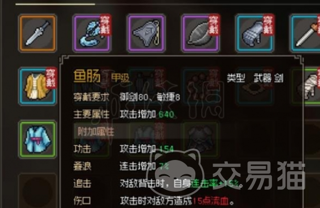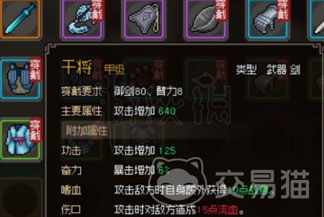 另外就是鱼肠,这也是一个橙色甲级武器,想要使用的话需要御剑达到八十,敏捷达到八,也能增加六百四的攻击能力,最后一个就是名为干将的甲级武器,除了要求比例为把其他的穿戴要求和主要属性都是一样的,具体的玩家可以看自身的数值是否能满足穿戴要求,选择一个自己喜欢的就能直接使用。