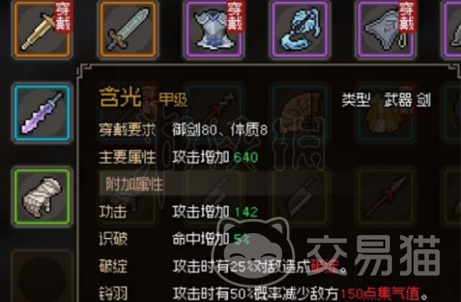 想要在游戏里获得橙色武器可以自行打造,在狼牙剑阁里面只需要使用相应的资源就能自行制造出橙色武器,要注意的是橙色武器出现的几率非常低,除了自行制造之,可以选择在游戏里战胜大师兄,这样就可以在三个橙色武器里面任选一个,首先第一个就是寒光,这是一个甲级武器,想要使用的话就需要体质达到八,御剑达到八十,使用之后角色的攻击力可以增加六百四。
