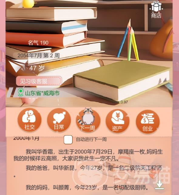 而在进这之前在这一周中,大家需要通过各种方法来养出自己所创建的角色,这养出需要从多个方面进行,这多个方面有社交、日常、创业等,这些都游戏中的一个个玩法模块,大家需要使用这些玩法。