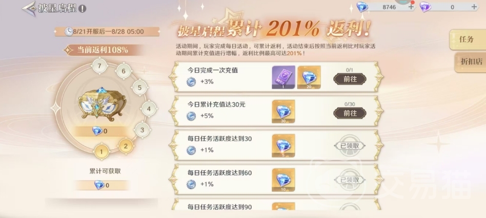 玩家完成每日任务不仅可获得返利比增幅,还有机会获得启程商店的折扣券等奖励,这些任务为期7天,每天都会在早上5:00刷新,保证了活动的持续性和新鲜感,上面的启程商店中折扣券如果过期未使用会被系统销毁,而未领取的蓝钻则会在活动结束后发放至玩家邮箱,确保大家不会错过任何福利。