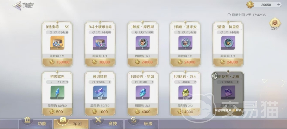 大家加入军团后就会解锁军团商店,这个商店中用的货币都是功勋,这是专属军团货币可用于在军团商店中兑换物品,大家不管是军团签到还是在上面参与活动都可以获取功勋,其中比较推荐购买的是神识砭石,这是来自地底世界的珍贵矿石,用于徽章的激活和升星,大家可以拿去给徽章升级,初级辉光500就可以买到,所以也是比较推荐的,用于给圣器升级,消耗一个可以提供200点经验,SSR斗士硬币自选宝箱也是不能错过的哦,虽然价格高,但是获取的都是SSR的斗士硬币。