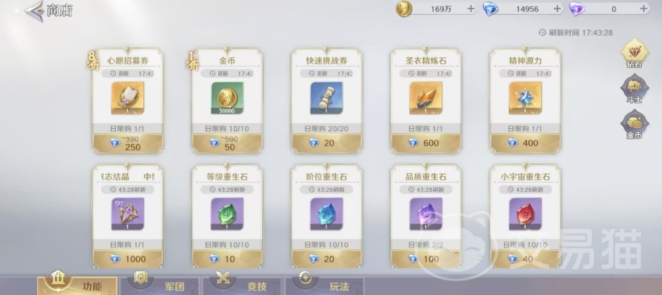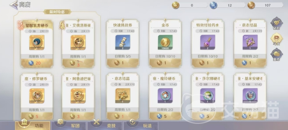 商店中包括钻石商店,大家可以消耗钻石来购买道具,这是系统中产出的绑定货币,也是用处比较多的,但是幸好获取途径也多,每日任务、守护雅典娜等等玩法中都可以获取,这里比较推荐大家买心愿招募券可用于心愿招募,获得斗士,金币的兑换比例也比较高50钻石可以换50000金币,但是没有必要买,游戏中获取金币的途径更多。