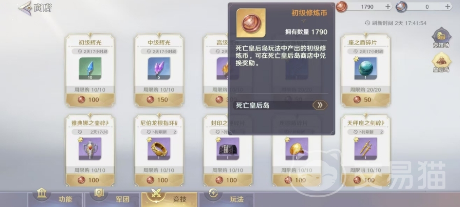 竞技商店中大家可可以用竞技场以及死亡皇后岛中获取的道具来购买物品,竞技币是竞技玩法产出的货币,用于竞技场商店购买道具,初级修炼币是死亡皇后岛玩法中产出的初级修炼币,可在死亡皇后岛商店中兑换奖励,精神源力是用于前五感星点激活的特殊材料,圣衣精炼石还有中级意志结晶这里也可以买到,这两个都是比较推荐的。