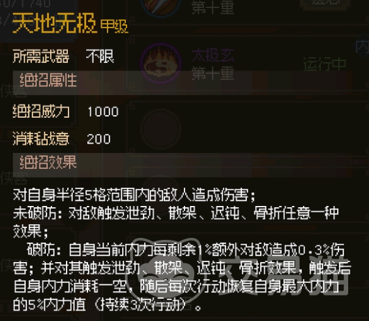 天地无极属于甲级招式,这个招式任何武器都可以使用的了。它需要消耗200战意才可以进行释放,这个绝招的威力则是1000。效果是对半径5格范围内敌人造成伤害,如果没有破防的话,则是会在4种DEBUFF之中随机给敌人上一种。