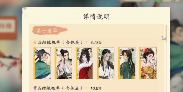 玩家获得角色卡的方式上通过结缘玩法来获得,结缘玩法就是这个游戏中的抽卡,可以抽一次也可以抽10次,建议玩家尽量以10抽的形式来抽取,在抽取上有保底。同时这些名士有品质的区别,最高为金色,然后上紫色、蓝色和绿色。在角色的培养上建议以金卡和紫卡为首要考虑。