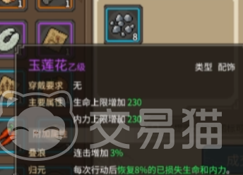 接下来,就是一些带有特殊性的物品,这也是玩家最感兴趣的一种。首先,就不得不提传国玉玺,他在皇帝线剧情中具有非常重要的地位,玩家可以发挥出玉玺的必定暴击以及攻防加成等多个属性。接下来就是大家都关心的玉莲花乙级配饰,由于没有任何穿戴要求,所以玩家可以快速获得提高自己的生命上限,还可以使用归元功能在行动后恢复一定的生命值。